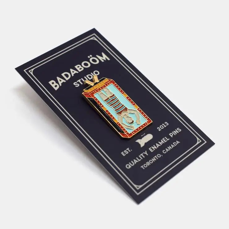 Soft enamel pin with gold outline, backing and rubber clutch.