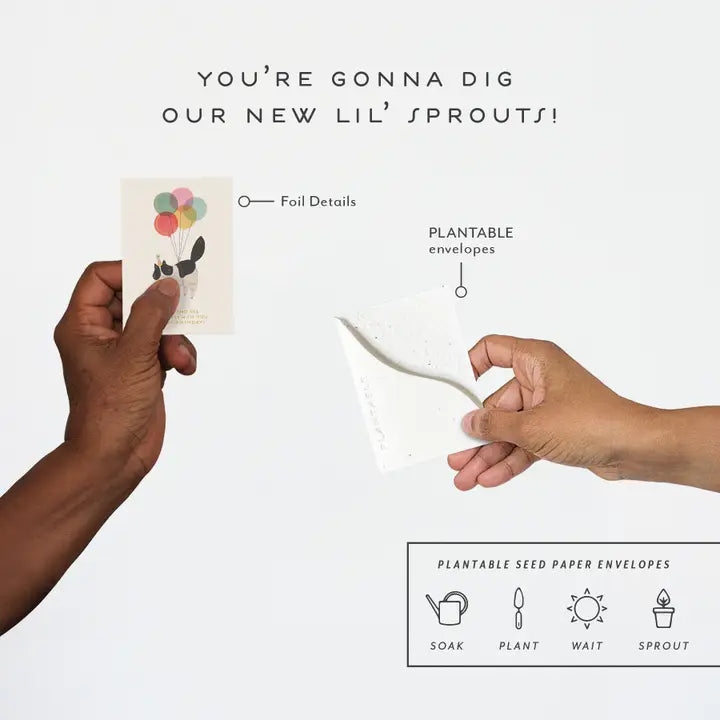 - Foil details and a PLANTABLE seed paper envelope which is embedded with wildflower seeds.