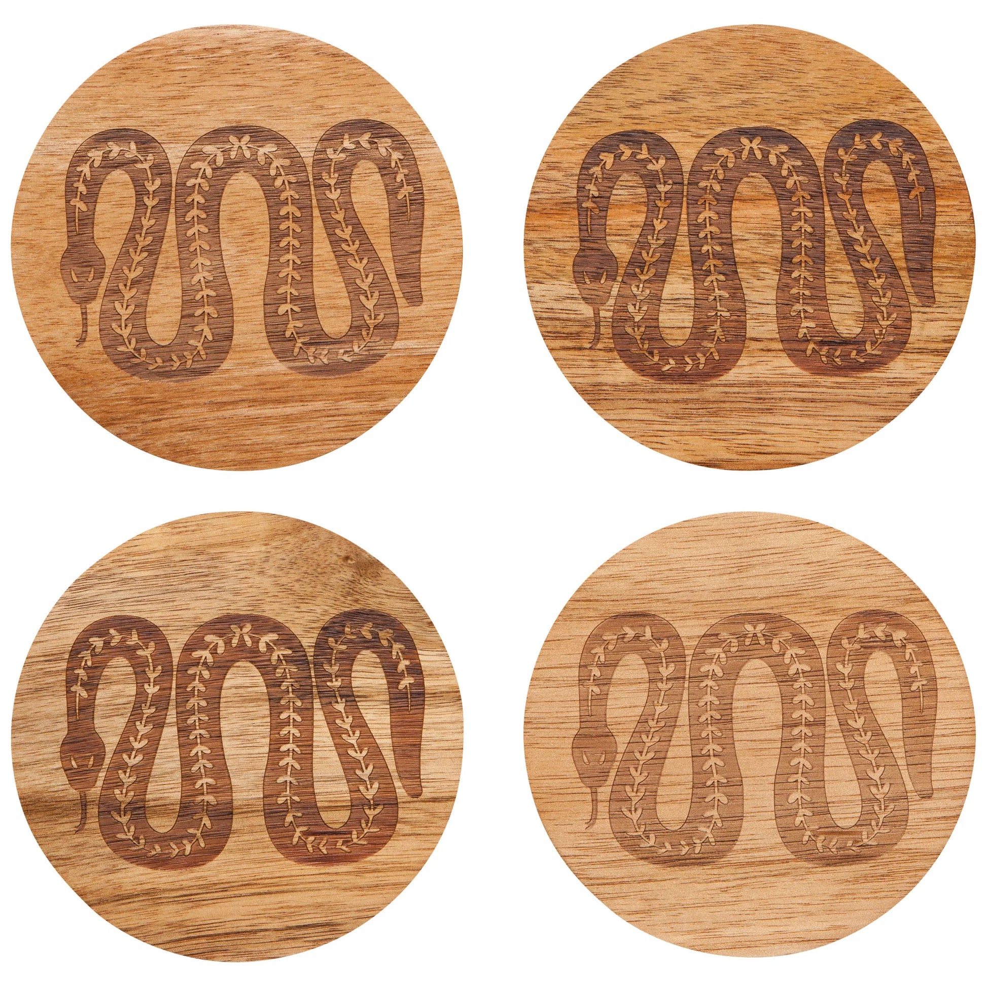 - Made from durable Acacia wood. These coasters are lazer engraved with our unique Imprint designs. Engraving is relatively shallow but texture can easily be felt. All four patterns within the set are the same (not assorted).