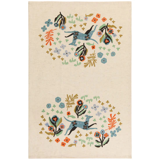 Bring a splash of fun to your kitchen with this lively set of two cotton tea towels. Combining eye-catching prints and woven textures, they make cleaning up both stylish and simple. Inspired by the Dogwood collection, each towel features a playful pup alongside a delightful blend of warm rust, soothing blue, and striking black hues.