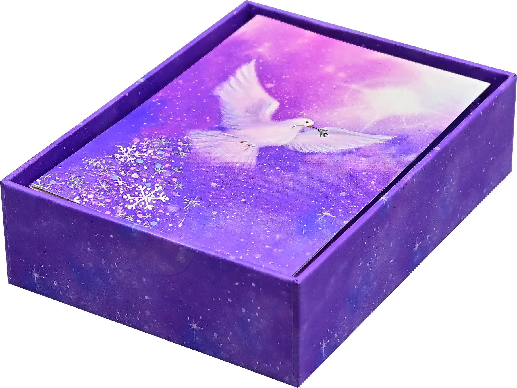 Beautiful little greeting cards depict a dove of peace in flight beneath the Christmas star.