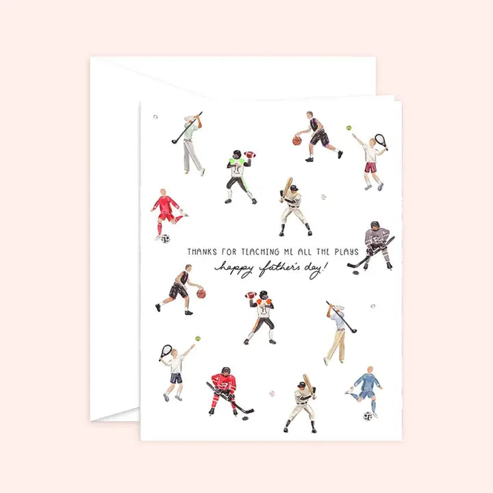 Honor the dad who’s been your coach, cheerleader, and teammate with this playful Father’s Day card. Featuring lively illustrations of football, soccer, tennis, and hockey players, it celebrates all the game-day memories and life lessons. The message, “Thanks for Teaching Me the Plays – Happy Father’s Day,” makes it a fun tribute to Dad.