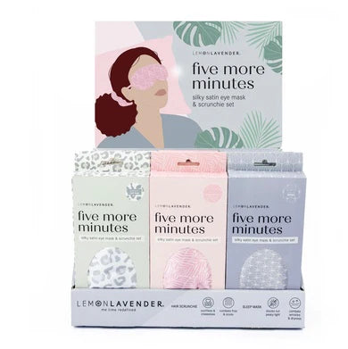 Get cozy with the Five More Minutes Satin Eye Mask + Scrunchie. The soft eye mask blocks light for better sleep, while the scrunchie keeps your hair neat. Sweet dreams made simple!