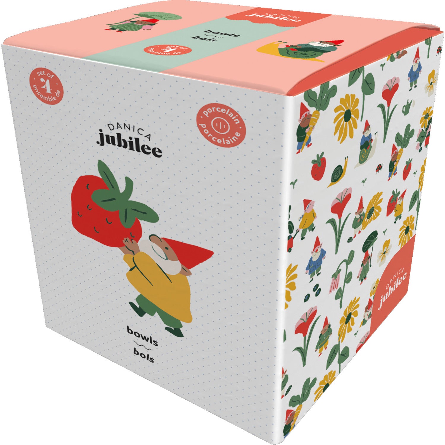 Add color and storybook charm to your table with Gnome Grown Bowls. Set of 4 assorted 14oz porcelain bowls, perfect for soup, cereal, or snacks. Dishwasher and microwave safe.