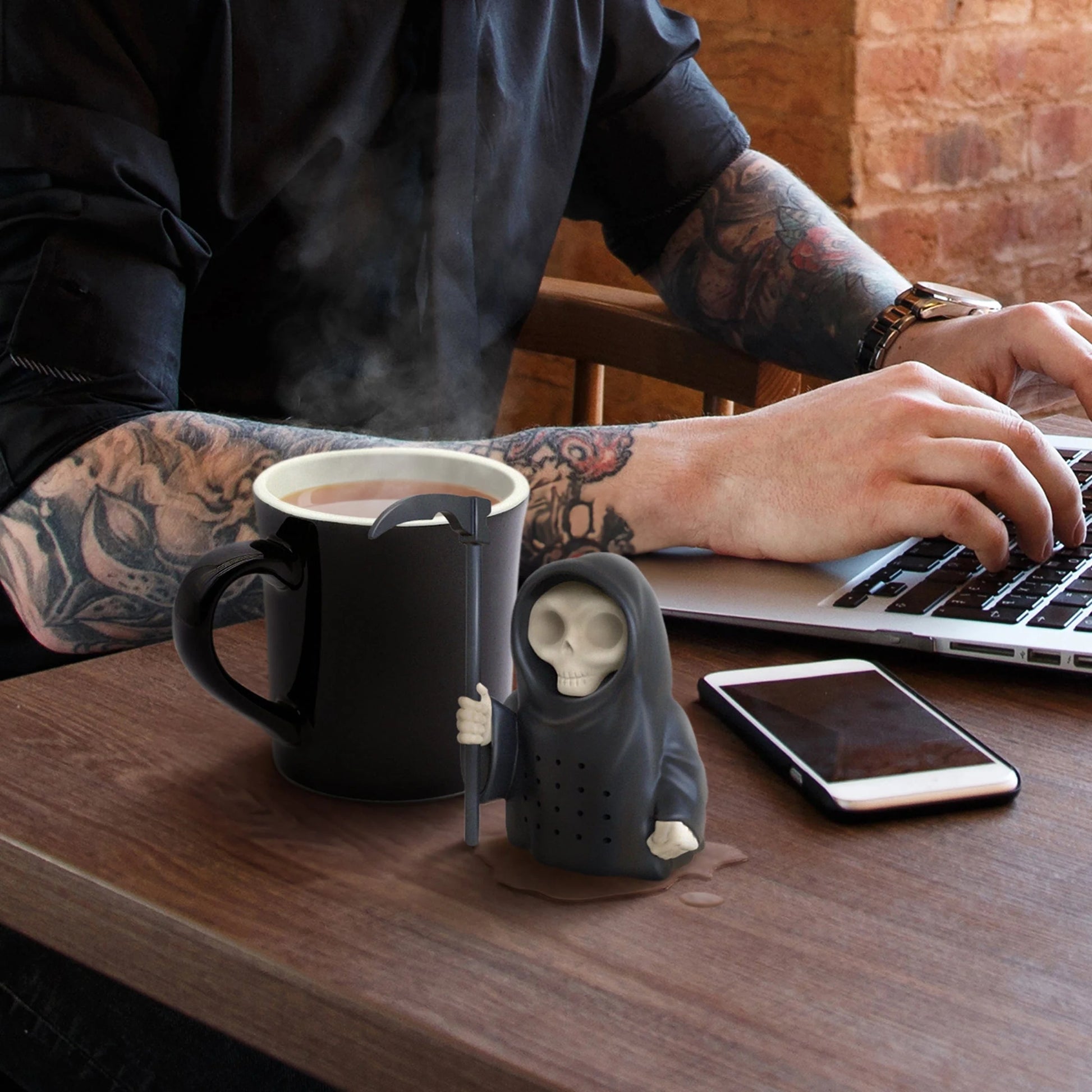 Free your spirit with Fred’s Grim Steeper – a hauntingly clever tea infuser that is sure to take your breath away. Simply fill with your favorite loose leaf tea, suspend his mighty scythe on the rim of your mug, and enjoy some soul-soothing sips. Constructed from heat-resistant, BPA-free silicone, it’s microwave and dishwasher safe.