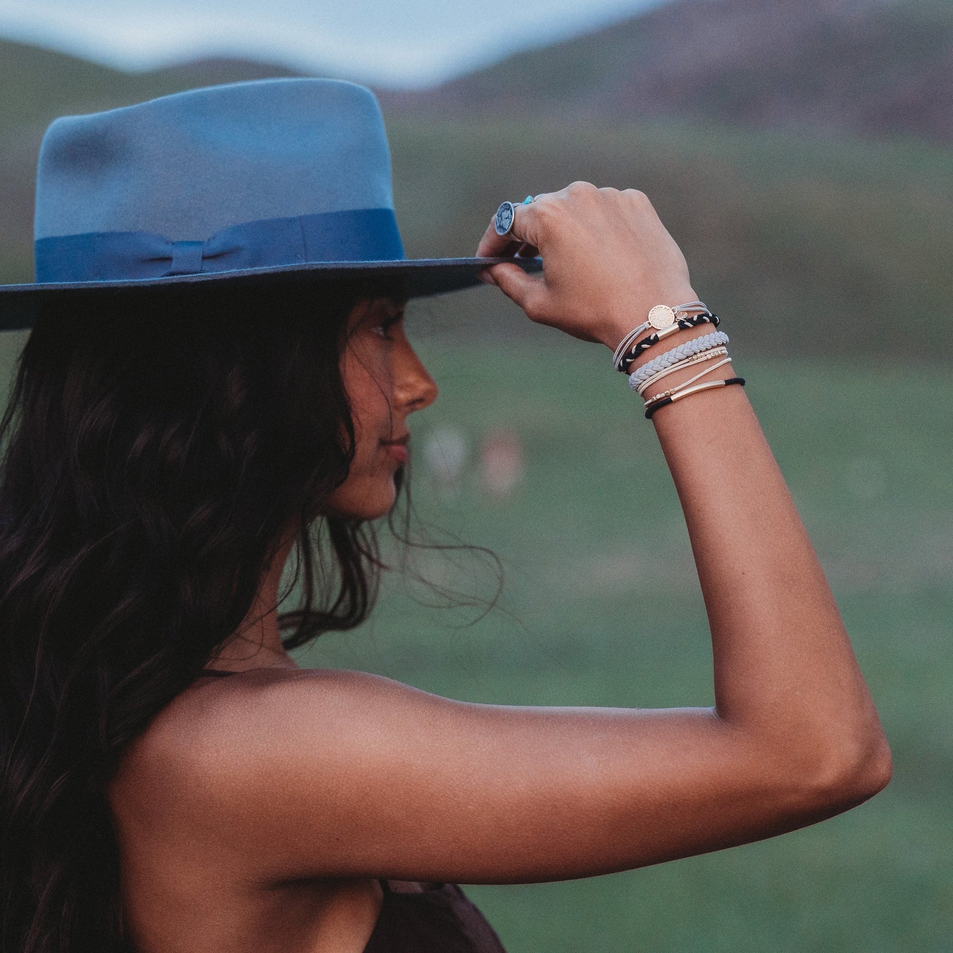 Inspire set includes five bracelets that double as hair ties in complementary neutrals. Including cream, gray, and black that will look great with any outfit. The sunflower charm in matte gold will inspire all of us to be a light.
