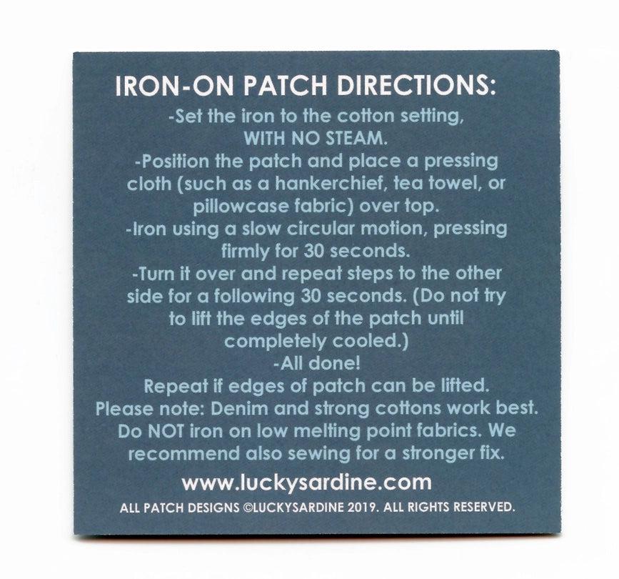 - Embroidered patch with an iron-on backing, 2.4" wide x 3.25" tall.