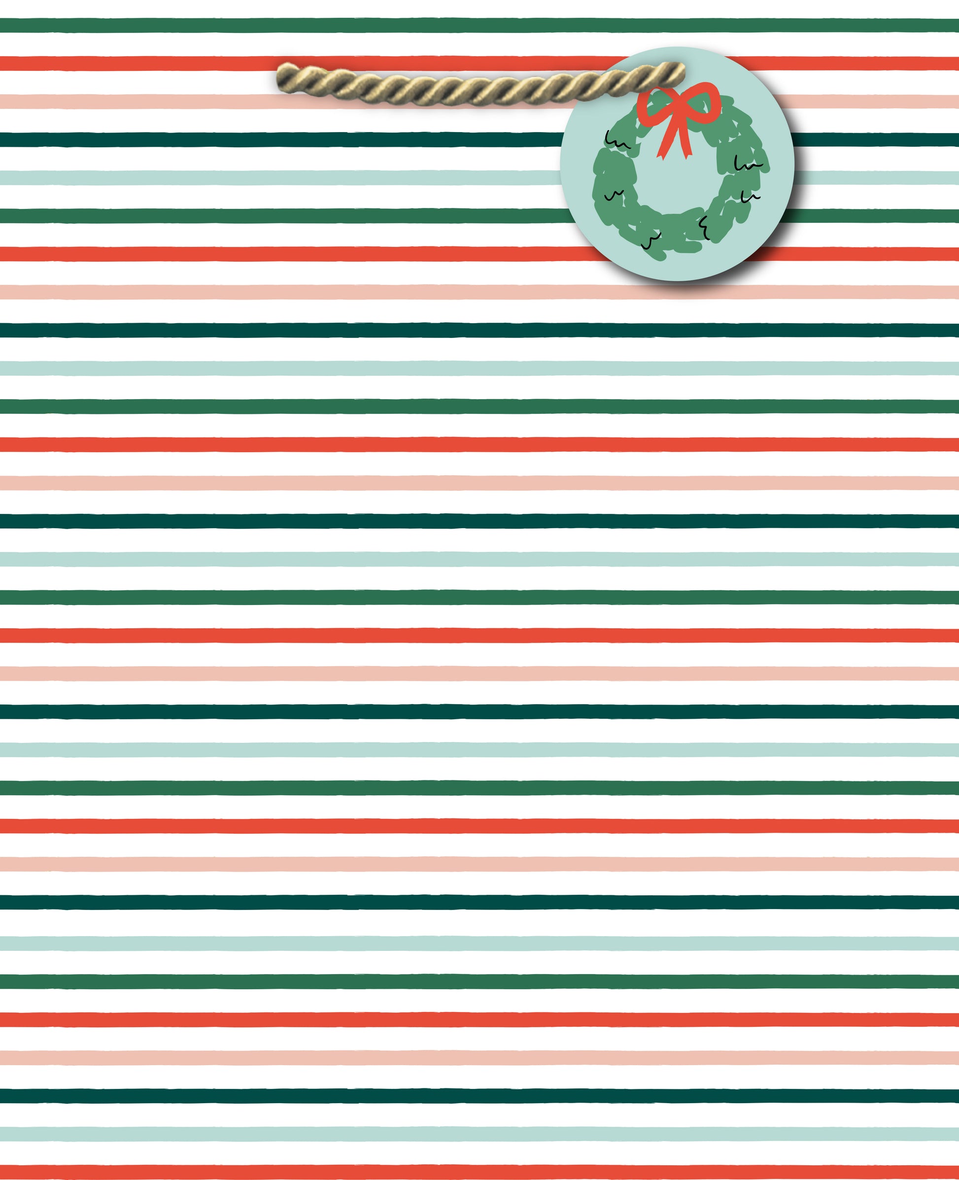 Wrap your gifts in holiday cheer with this large bag! It has red, green, and white stripes, shiny gold handles, and a festive wreath tag. Perfect for a joyful, stylish gift.