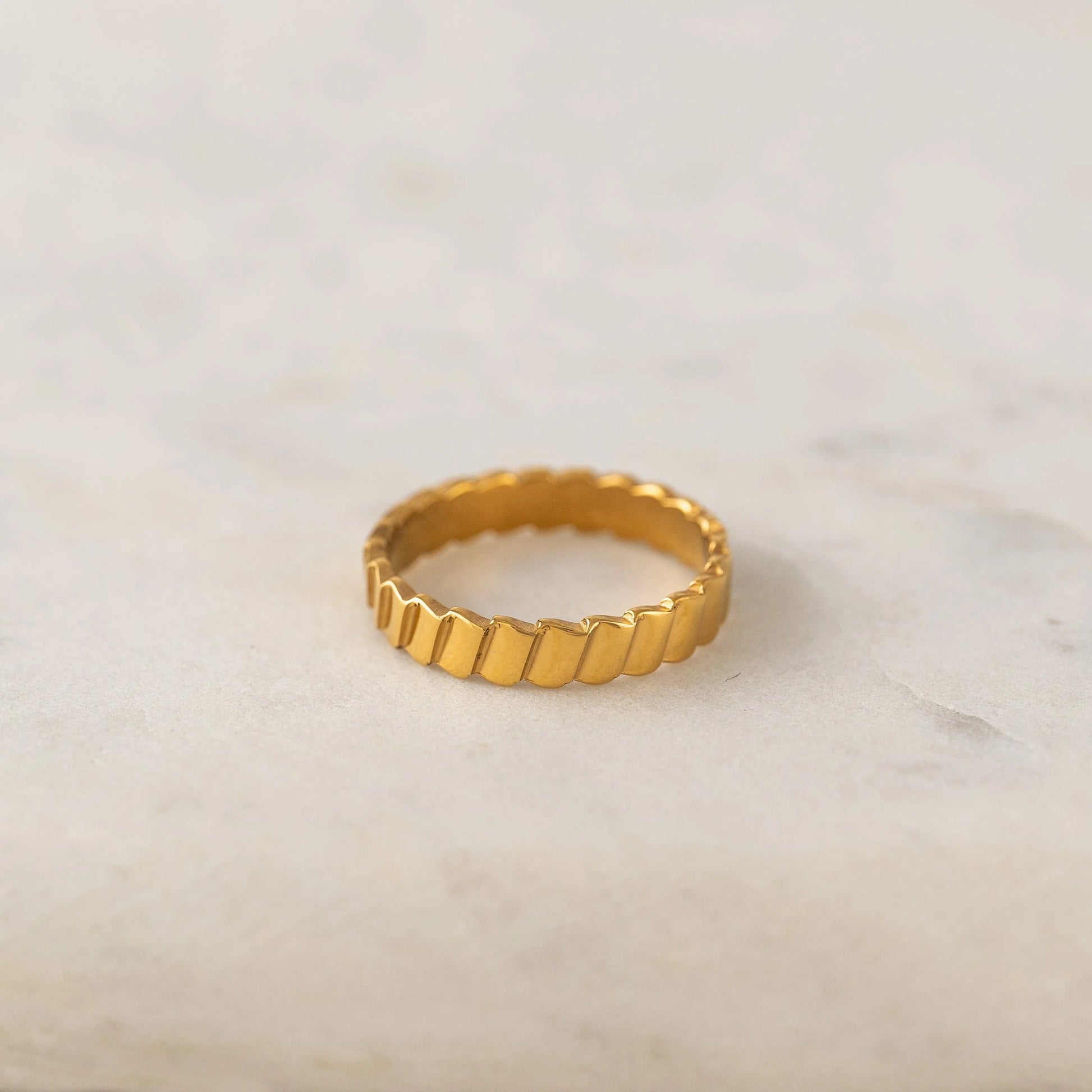 With its jagged yet refined surface, this light-catching band is akin to sunshine. Made with PVD and stainless steel, you can wear this waterproof ring anywhere.