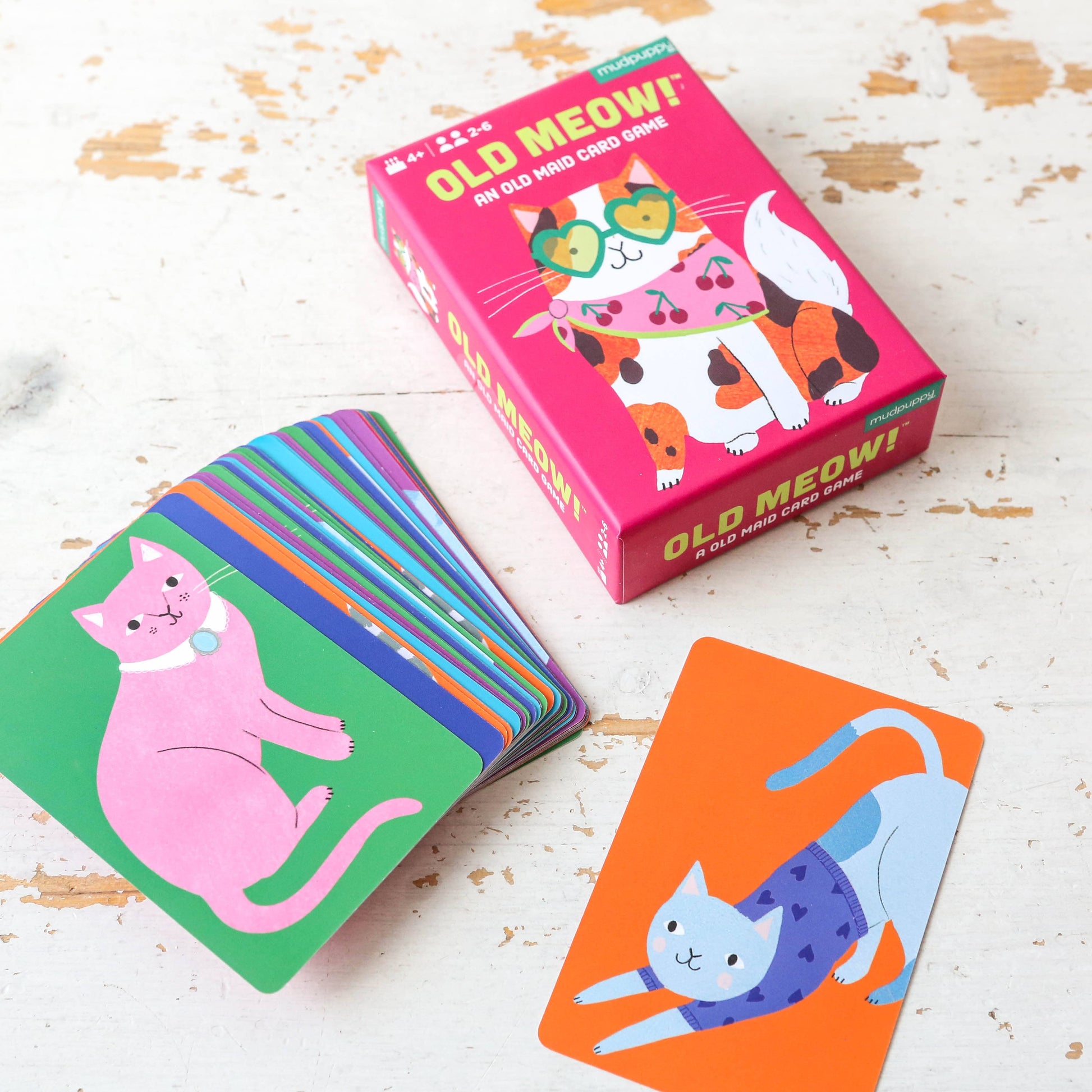 Old Meow! Card Game features colorful cards with adorable cats designed by Rebecca Jones. This new take on the classic Old Maid game doesn't have numbered cards, so everyone can participate. The deck comes in a sturdy drawer box for safe keeping. Instructions are included.