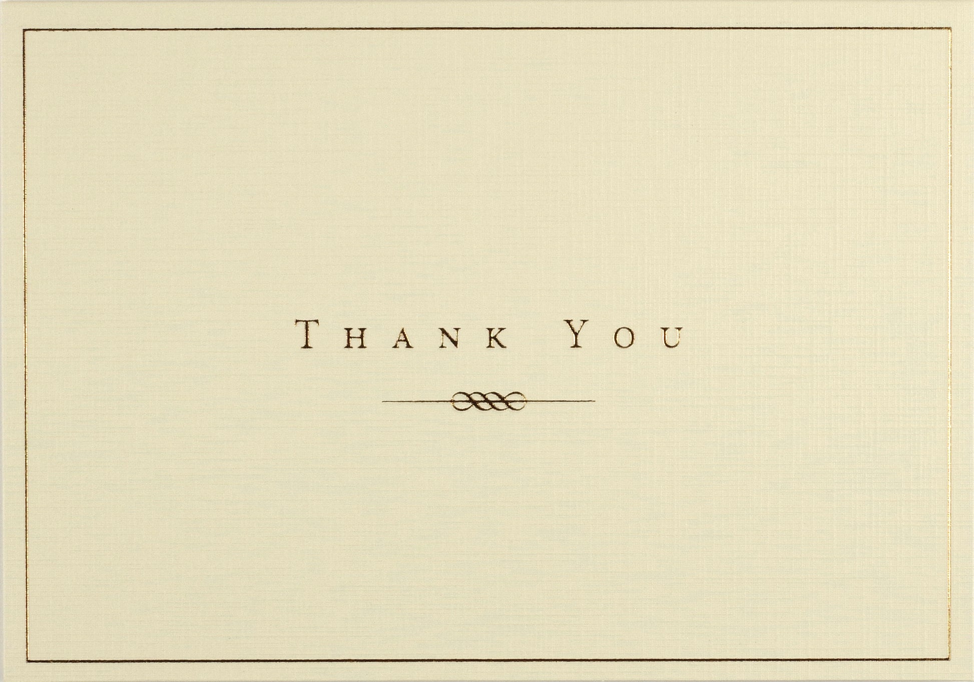 Express your thanks with a personal note and a beautiful card! Suitable for a variety of occasions and are embellished with complementary treatments, including gold or silver foil, gloss highlights, embossing, a linen-like exterior finish, and more. Design features the words ''thank you'' in stately print on an ivory background, above an elegant gold design.