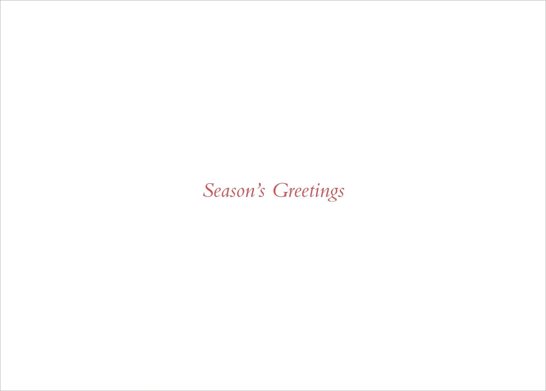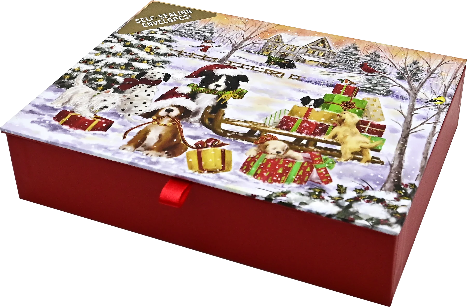 Pups in Santa hats and scarves inspect a sled piled high with gifts on this adorable greeting card. In the background: festive trees, colourful birds, a snowman, a pick-up truck, Christmas tree, and a house aglow, ready to welcome all home.