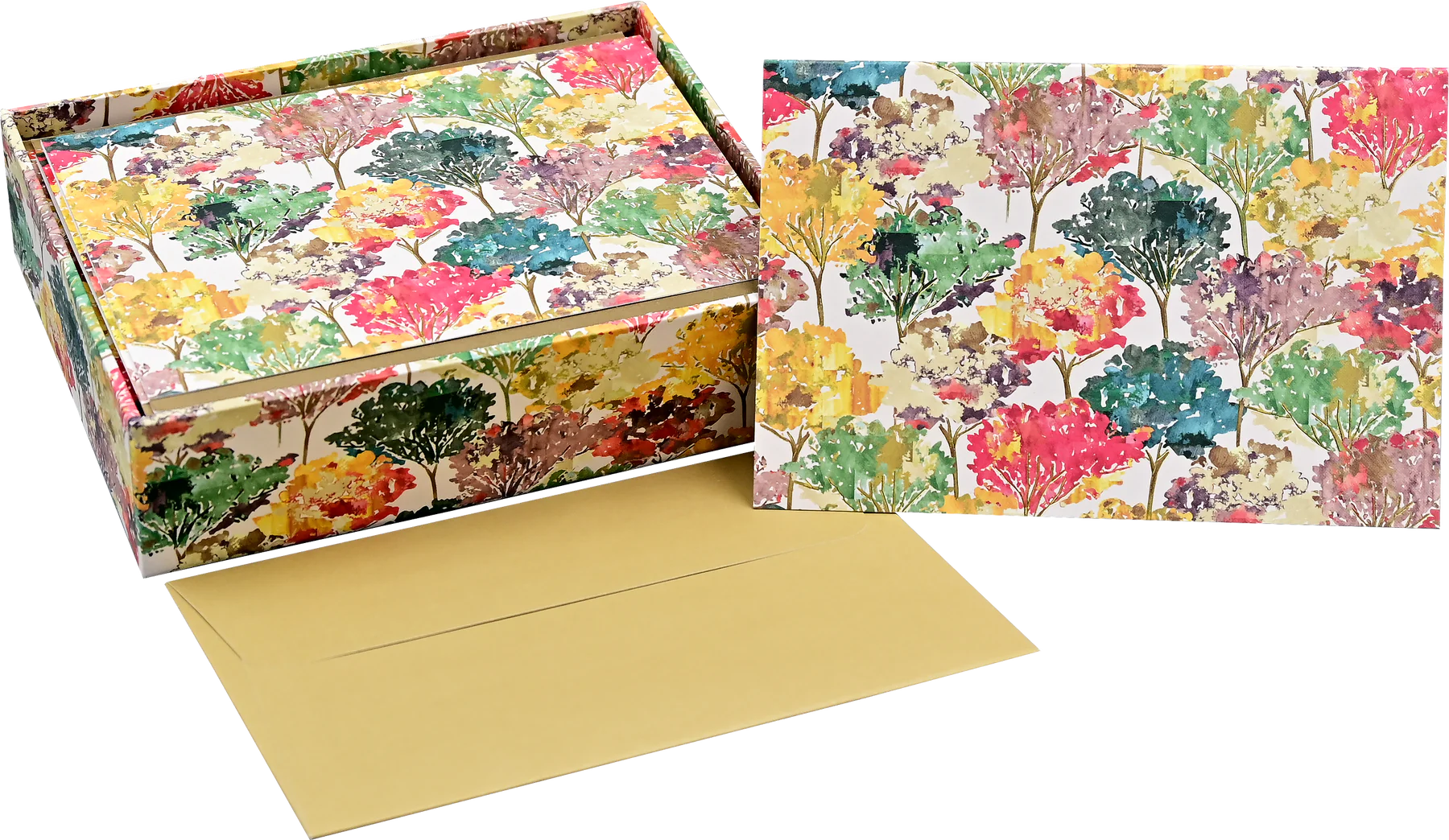 Autumnal hues are the focus of these elegant note cards, with an image of vibrant trees set above a matching border.