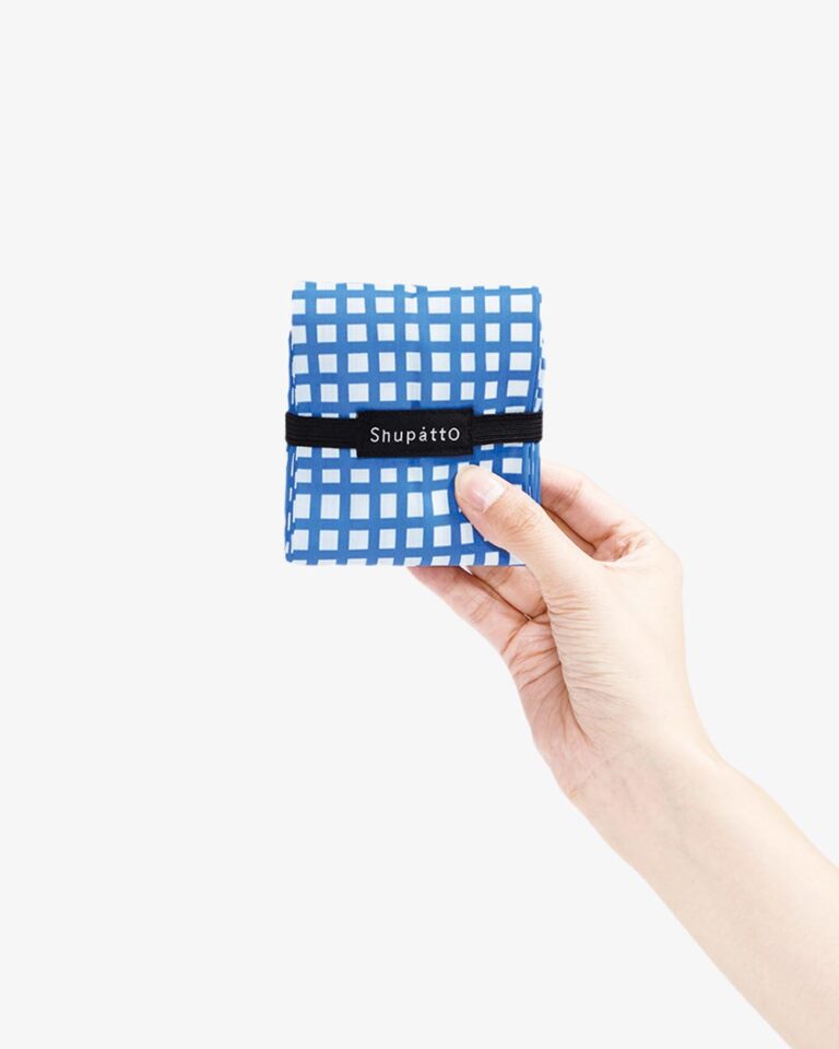 Pull the bottom and handles into a strip — it folds into a compact square about the size of a handkerchief. Tuck it into your main bag and you're ready to go.