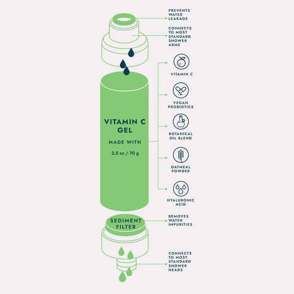 Vitamin C removes residual chlorine and other impurities from hard water to rejuvenate your skin and condition your hair, one shower at a time. Vegan probiotics strengthen and regenerate the skin barrier, while oatmeal powder softens and soothes for healthy, glowing skin. This shower filter gives a whole new meaning to clean. It will be the best shower you'll ever take!