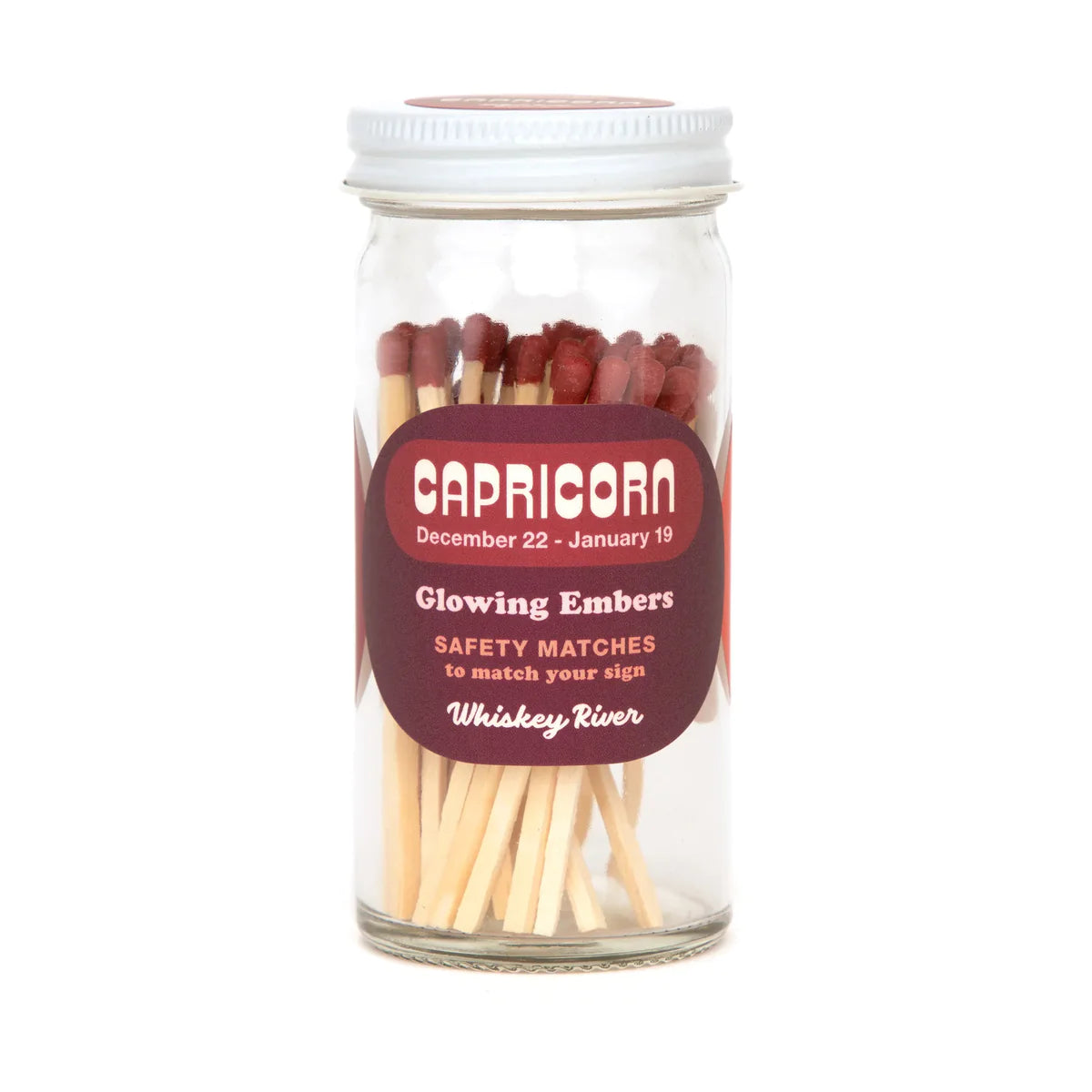 Whiskey River Astrology matches feature wooden matchsticks with coloured heads that coordinate with the label of each glass jar, providing a perfect aesthetic match. These 4 1/4" H x 2" W x 2" D jars strike on the bottom for convenience and safety.
