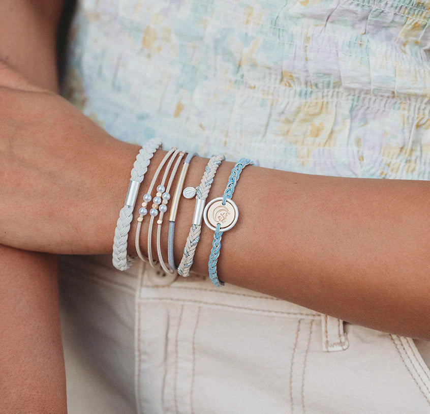 Wonder set includes five hair tie bracelets in gorgeous light neutrals. You will find pearls, golds, and silvers to make this set mix well with any other jewelry. A moon and stars on the charm will keep our sense of wonder alive.